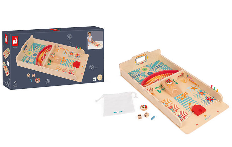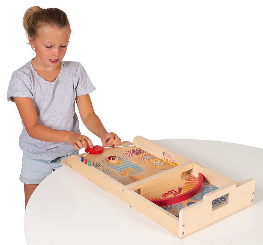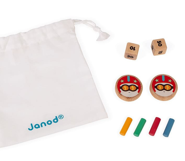 Description : Voilà le classique jeu de palets revisité avec des couleurs vives et des illustrations punchy ! Ce jeu de palet en bois, qui peut se jouer seul, est un jeu d’adresse et de concentration idéal à partir de 6 ans. Comment être le champion des palets ? C’est simple, utilisez le lanceur pour diriger et envoyer le palet dans les différentes zones de couleur en visant pour atteindre le nombre de points maximum ou en laissant la chance vous accompagner ! Ce jeu convient à toute la famille car il comporte plusieurs niveaux de difficulté. Niveau 1 : chaque joueur doit marquer un maximum de points en 10 coups. Niveau 2 : le joueur lance les dés qui lui indiquent le nombre de points à atteindre en un minimum de coups ! Pour être le meilleur, il faudra bien viser, éviter les pièges et réussir le super lancer dans la lucarne pour gagner les 100 points tant convoités ! Pour le style, on adore ! Du bois naturel, des illustrations colorées et des jetons qui ont passé leur plus beau casque pour prendre de la vitesse avec classe !