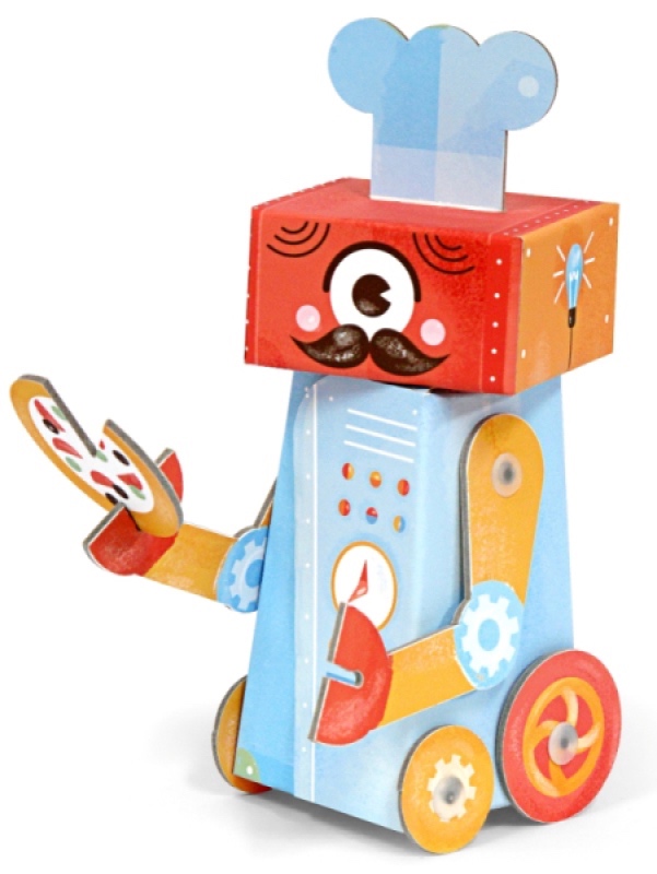 Voici Chef  le Cuisinier de la famille des robots. Une pizza, un dessert ? Pas d’inquiétude, il a tout ce dont vous avez besoin. Accompagné d’un adulte, votre enfant donne vie au Scientifique à l’aide des cartonettes pré-découpées et encochées.