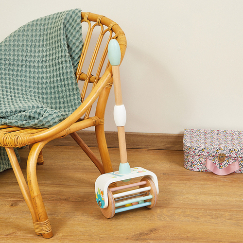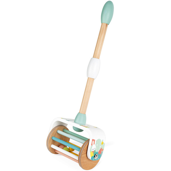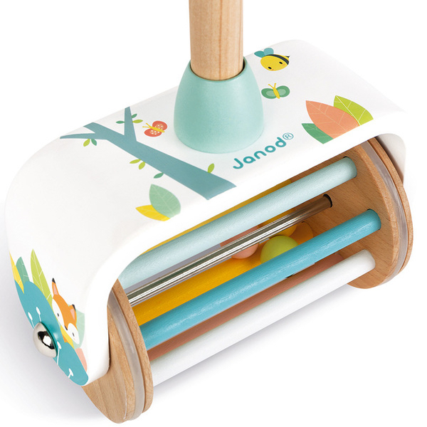 Un joli jouet à pousser Lorsqu’il le fait rouler, les balles à l’intérieur s’animent et tintent entre elles. Poignée dévissable et ajustable selon la taille de votre enfant (position haute ou basse). Un design trop mignon.