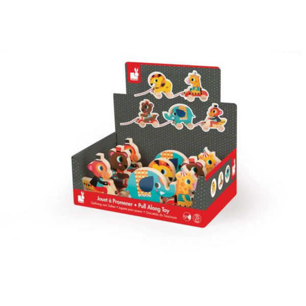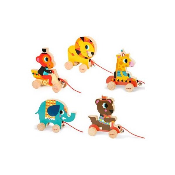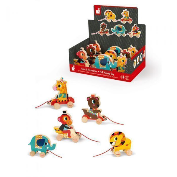 Collectionne les 5 modèles assortis de la gamme Jouet à Promener Cirque : Le lion, l’ours, le singe, l’éléphant, et la girafe.
