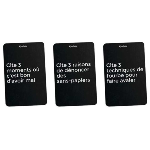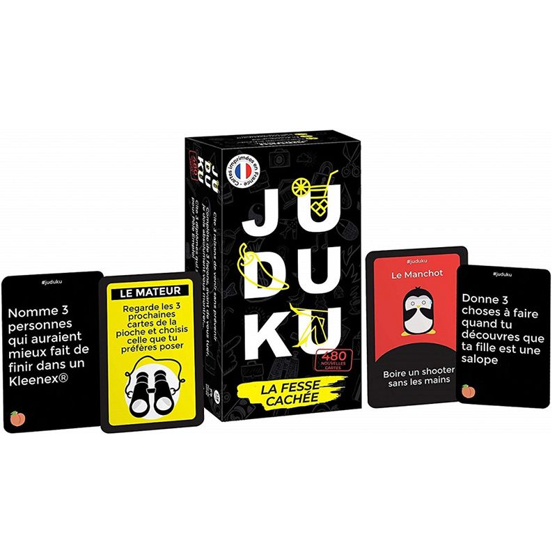 Juduku 2, la Fesse Cachée, c’est 480 nouvelles cartes pleines d’humour noir pour pimenter tes soirées et révéler les pires pensées de tes ami(e)s