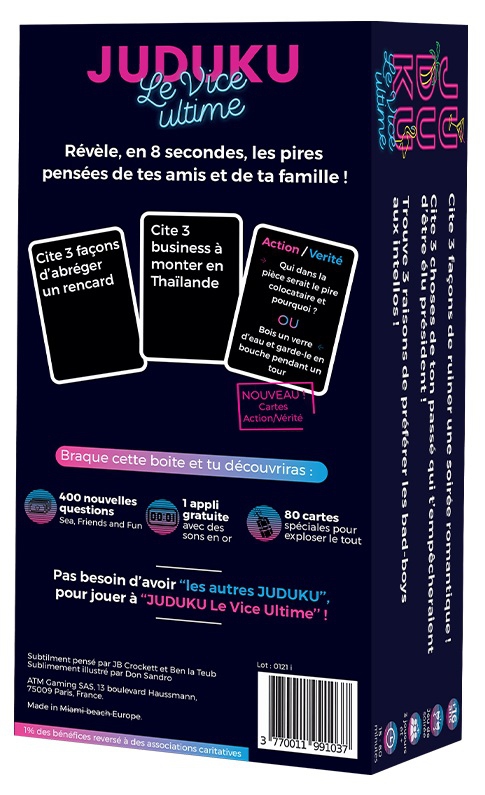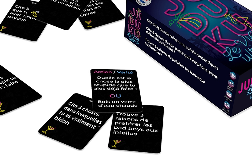 Juduku Le Vice Ultime, c’est 480 nouvelles cartes pleines d’humour noir pour pimenter vos soirées et révéler les pires pensées de tes ami(e)s ! Dans une ambiance des années 80, ce Juduku Le vice ultime révèlera tes pensées les plus sombres. Un jeu d’ambiance idéal pour pimenter les soirées.