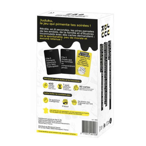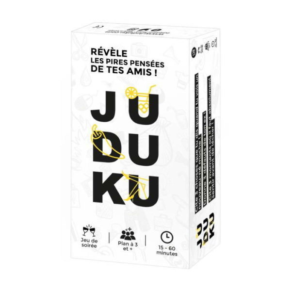 Révèle les pires pensées de tes amis avec des cartes demandant spontanéité, peu de morale et aucune retenue ! Juduku est un jeu d’ambiance pour 3 à 12 joueurs, pour 16 ans et plus.