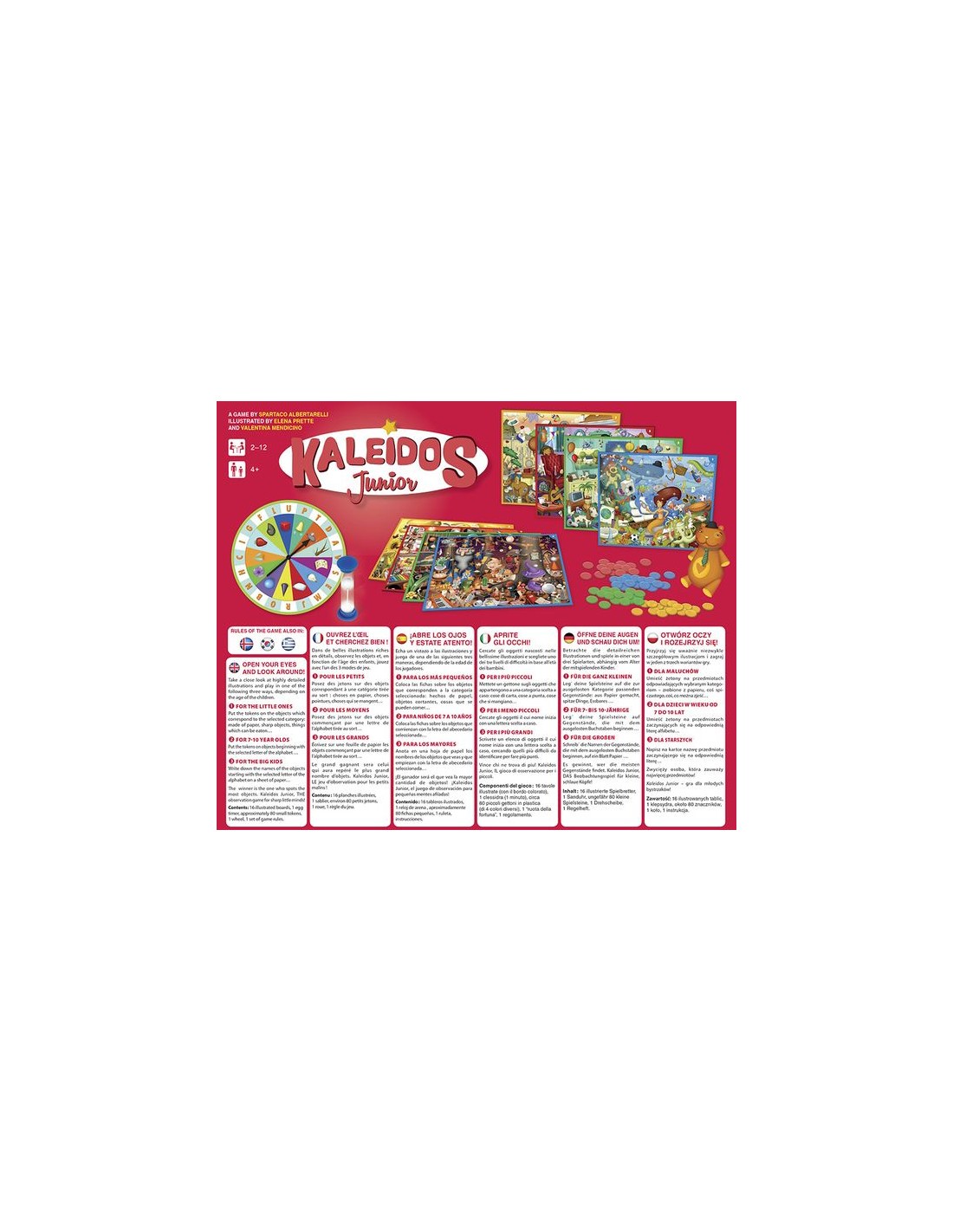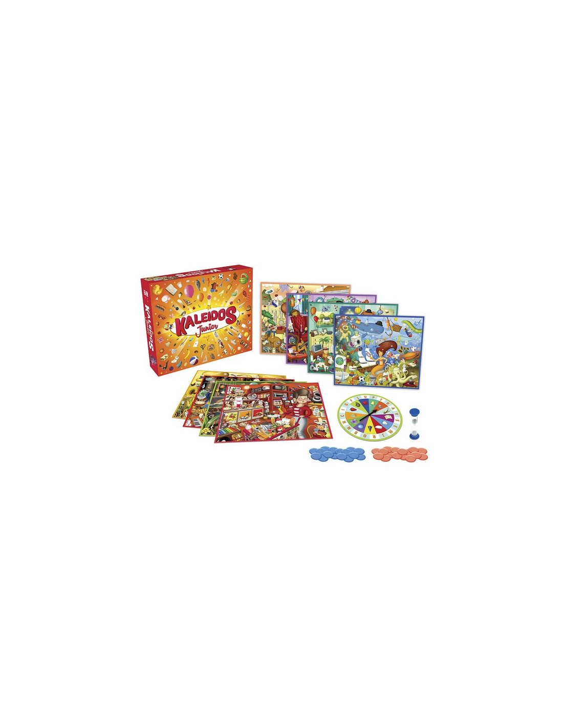 Kaleidos junior, un jeu d’observation pour les enfants à partir de 4 ans qui vont chercher dans une illustration très détaillée le plus grand nombre de choses qui correspondent à une catégorie (comestible, en bois, mou…). Les plus grands chercheront des objets qui commencent par une lettre. Observez bien et placez tous vos jetons sur les objets.