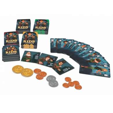 Contenu du jeu : 45 cartes enfant des rues, 9 tuiles Personnage, 1 tuile Rappel des personnages, 60 pièces, un livret de règles.