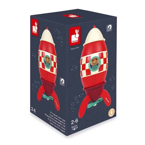 Prêts à partir pour les étoiles ! Ce jeu ludique et amusant de construction est le jouet signature de la marque Janod. Votre enfant pourra assembler les 3 parties  magnétiques et reconstituer une magnifique Fusée en bois. Un petit astronaute amovible prendra place au centre de l’engin !