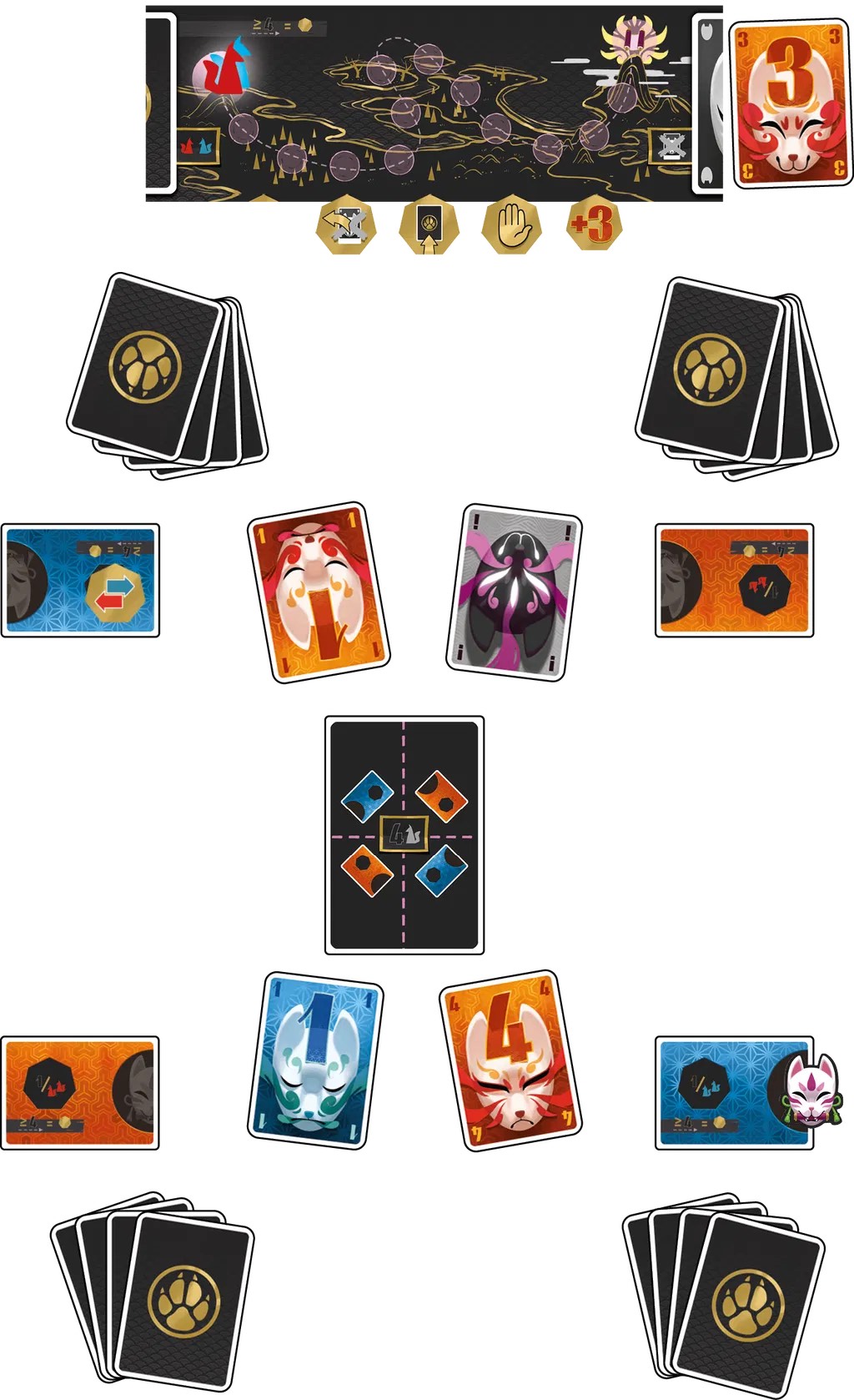 Dans le jeu Kitsu, les parties se jouent à 1 contre 1 ou par équipe à 2 contre 2 ou 3 contre 3. Que vous soyez seul ou en équipe, un clan vous sera attribué dès le début de la partie. Vous jouerez ensuite une succession de plis, qui constituent une manche.