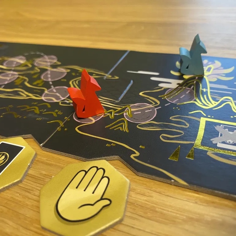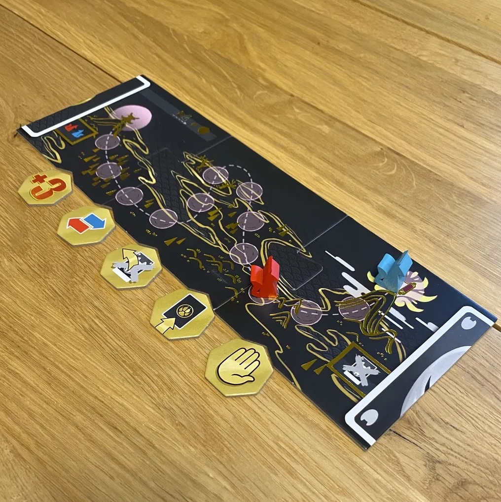 Ainsi, lors de vos tours, à chaque pli, vous devrez jouer avec les cartes de votre clan mais aussi celui de votre adversaire. La somme des valeurs jouées pour chaque clan détermine le clan vainqueur du plis. Celui-ci peut ainsi faire progresser son pion Kitsune sur la piste de la sagesse d’un nombre de case correspondant à la différence entre la valeur totale des cartes Kitsu Orange et Bleues. Si cette différence est supérieure à 4, l’équipe qui a perdu le pli peut récupérer un puissant jeton Pouvoir.