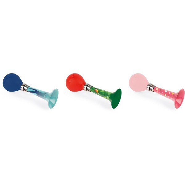 Trois modèles de Klaxons sont proposés, ici le bleu marine et bleu ciel, un rouge et vert, un rose pâle et rose. Ces klaxons sont en métal et plastique.