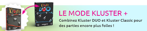 Vous avez déjà succombé au charme magnétique de Kluster Classic ? Cela tombe bien car Kluster DUO va vous permettre de combiner les deux boîtes. Les aimants des deux versions disposant de tailles et d’aspects bien différents, une couche de stratégie supplémentaire viendra s’ajouter à vos parties. Selon la situation, vous serez amené à choisir entre poser un des gros aimants de Kluster DUO ou une des petites pierres aimantées plus facilement posables de Kluster Classic. Fou rire garanti !