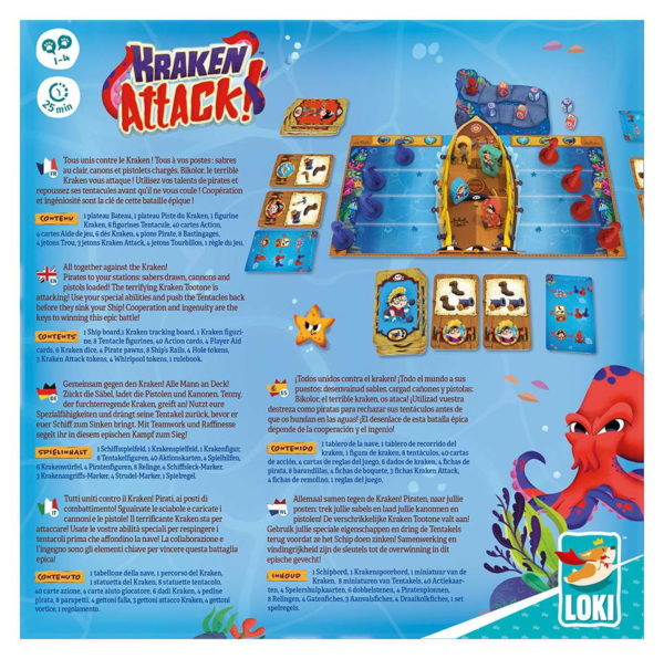 Contenu du jeu : 1 plateau Bateau, 1 plateau Piste du Kraken, 1 figurine Kraken, 4 pions Pirate, 8 Bastingages, 8 figurines Tentacule, 40 cartes Action, 4 carte Aide de jeu, 6 dés Kraken, 4 jetons Tourbillon, 3 jetons Kraken Attack, 4 jetons Trou, 1 Règle du jeu.