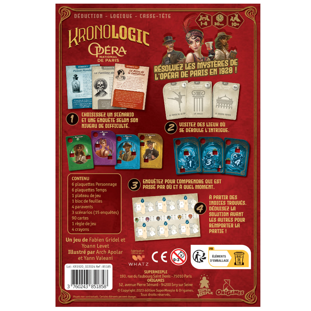 Résolvez les mystères de l’Opéra de Paris pendant les Années Folles ! Kronologic Paris 1920 est un jeu d’enquête, de logique et de déduction. Jouez et traversez les époques, qu’elle soit contemporaine, historique, ou même futuriste ! Dans ce jeu de société, démêlez une série d’affaires inexpliquées et rétablissez la vérité.