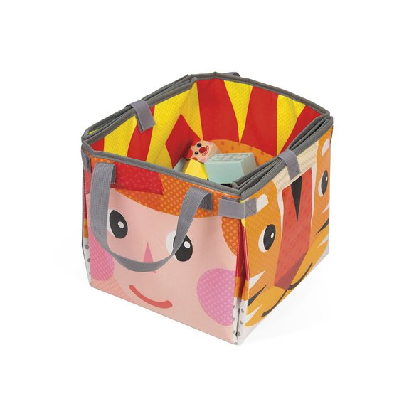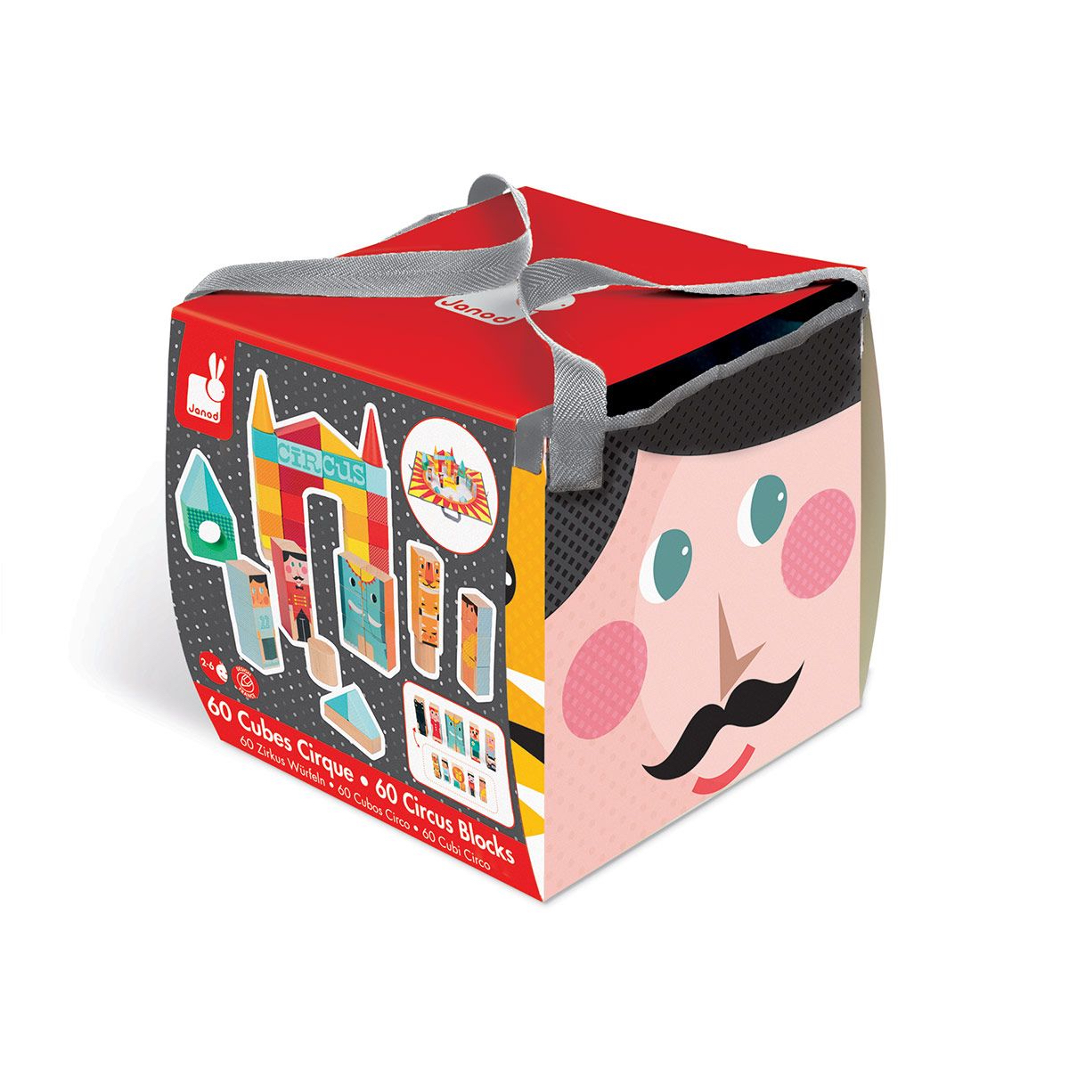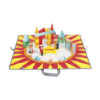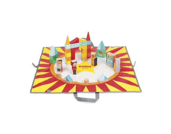 Ce jouet est constitué de 60 blocs de construction en bois massif aux couleurs vives, peints à l’eau, pour construire tout un univers sur le Cirque. L’enfant joue sur un tapis de jeu double face »Piste de cirque » qui sert également au rangement et au transport.