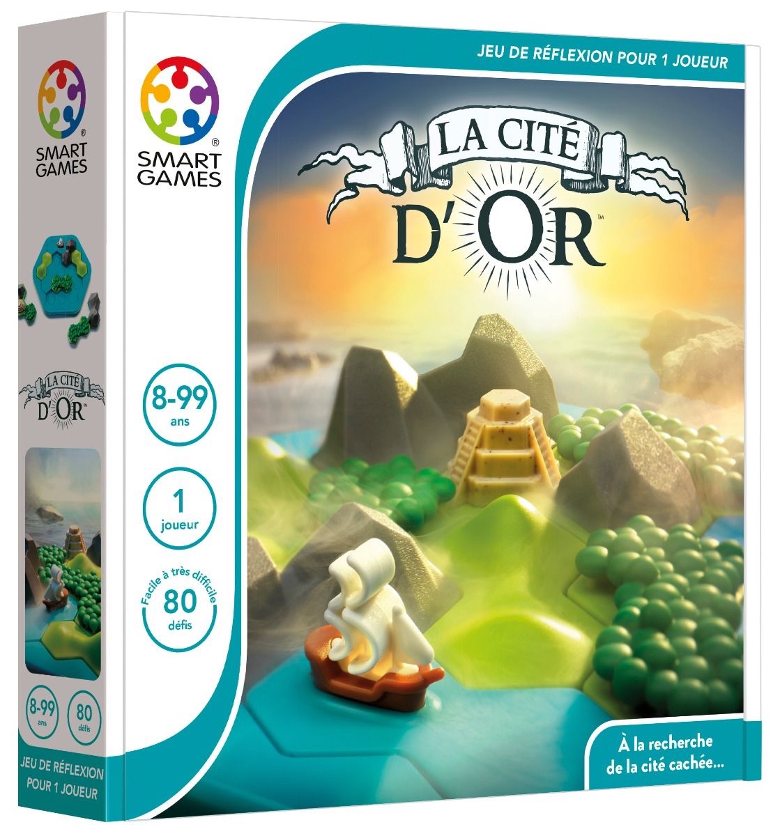 La Cité d’or est un jeu de logique et d’aventures proposant 80 défis evolutifs, de facile à très difficile. Explorez les mers, partez à la recherche de la Cité d’or cachèe … rassemblez vos compétences, assemblez les quatre tuiles terrains articulables afin d’atteindre la mythique Cité d’Or ?