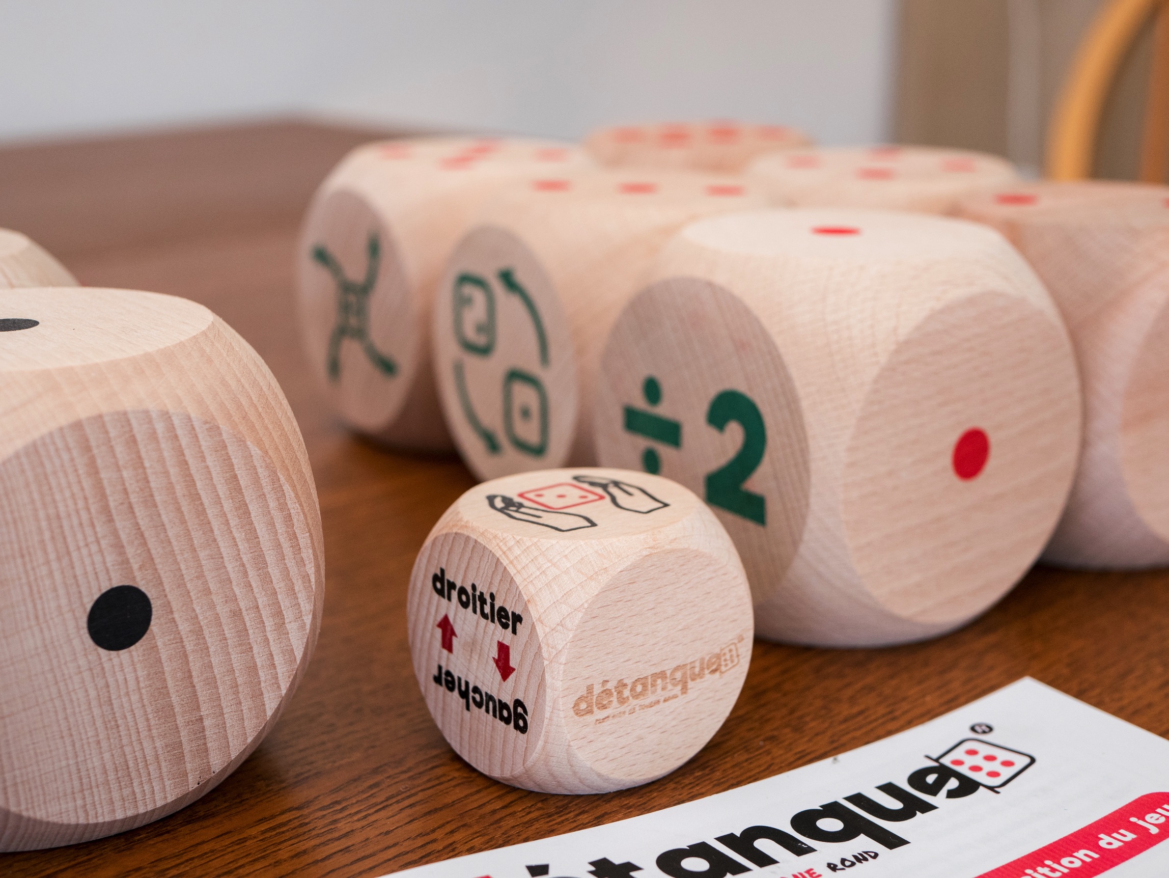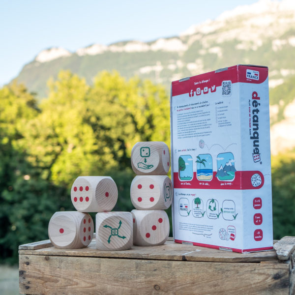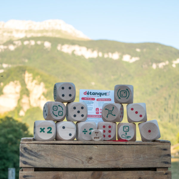 Contenu du jeu de Détanque ® : 12 gros dés (Caboules®) de 75mm de côté, 1 Cochodé®, une règle du jeu complète, le carton de transport avec poignée intégrée et un fil pour mesurer ! Un jeu zéro déchet et zéro plastique.