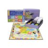 Coffret de jeu avec plateau, cartes, billets, dés et pions.