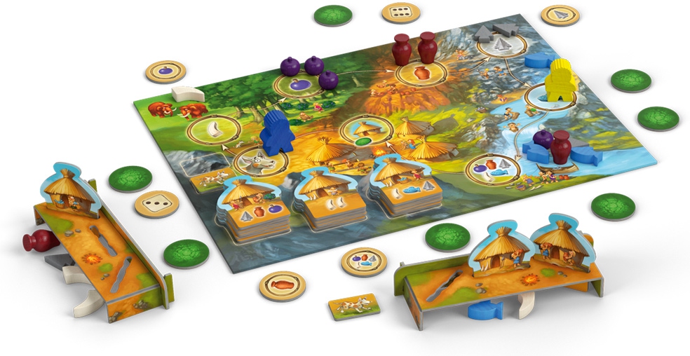 Contenu du jeu : 1 plateau de jeu, 4 villages, 35 jetons, 24 pièces en bois, livret de règles.