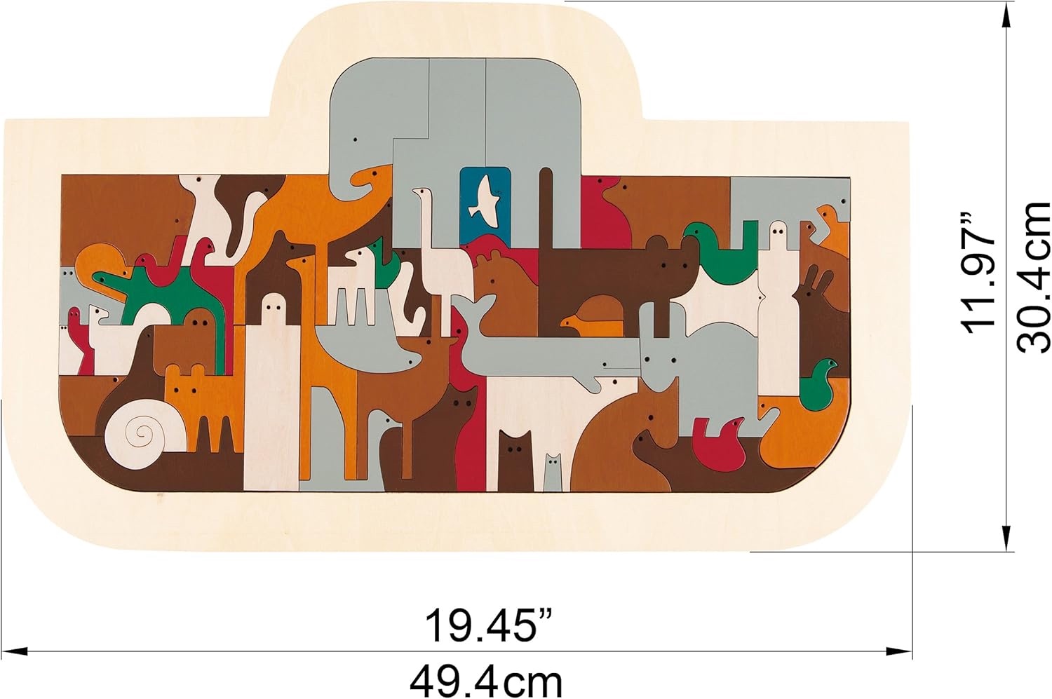 Dimensions puzzle : 49,4 x 30,4 x 1,2 cm. Découpe laser et peinture à base aqueuse.