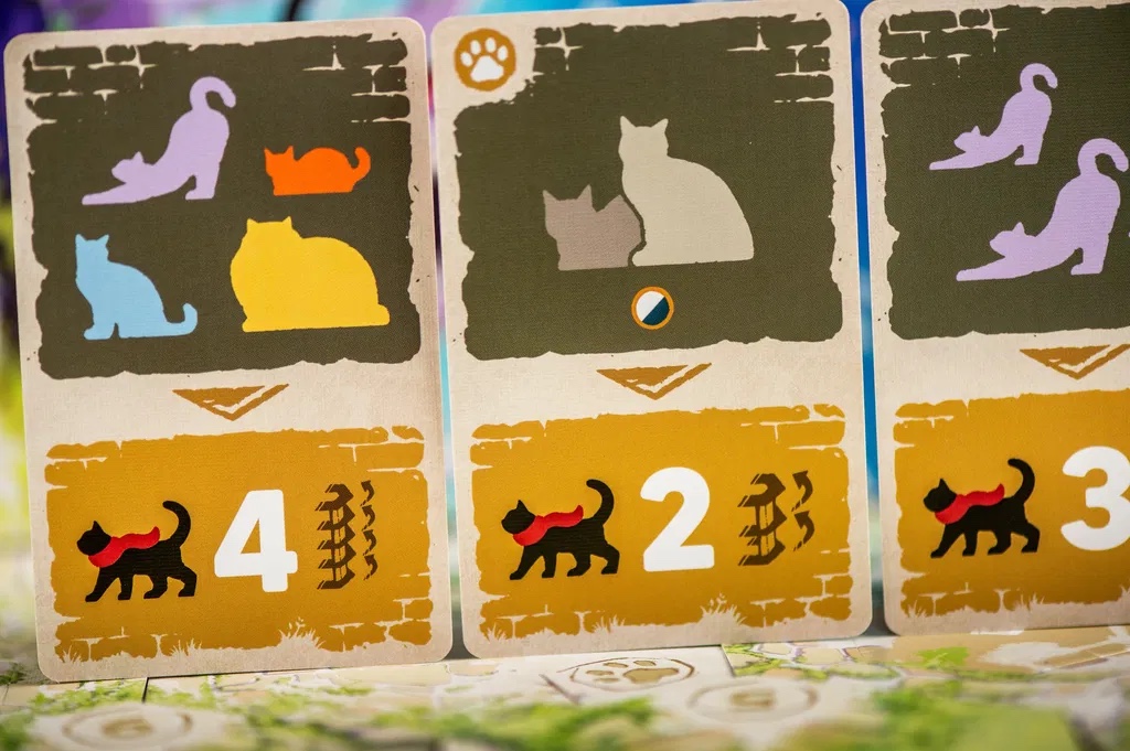 Contenu : 54 tuiles Mur, 24 tuiles Étage, 21 pions en bois Chat, 36 cartes de jeu, 5 jetons en bois Patte, 5 stickers Palier, 1carte Référence et un livret de règles.
