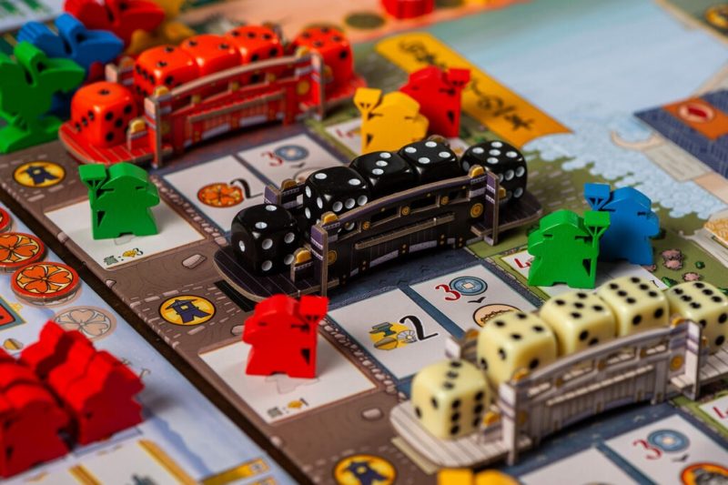 Avec ses mécanismes de placement d’ouvriers et de gestion de ressources, le Château Blanc est un jeu classique de gestion calculatoire. Le panneau central montre le château de Himeji dans toute sa splendeur, divisé en plusieurs zones. Le plus grand se trouve à l’intérieur du château, avec la Salle des Mille Tapis, où les courtisans doivent monter socialement jusqu’à atteindre le cercle le plus proche du Daimio pour bénéficier de ses faveurs. Il y a aussi l’étang et les jardins, patiemment entretenus par les jardiniers où chacun peut se détendre et contempler sa beauté sans restriction. Une autre zone importante est le mur et l’extérieur du château, où les guerriers patrouillent et montent la garde. Enfin, on retrouve la zone des trois ponts, où s’accumulent les trois types de dés pouvant être utilisés pour réaliser des actions, et le domaine personnel de chaque joueur, où il gardera une trace de ses ressources et où il aura le réserve de travailleurs.