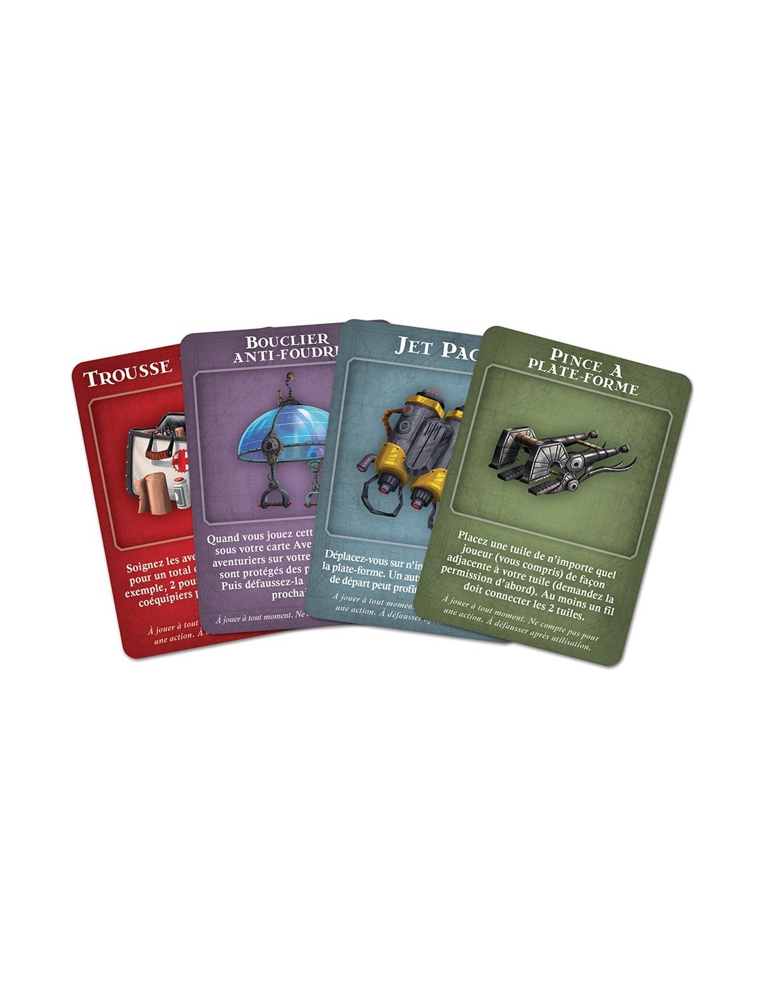 Le jeu contient 49 cartes, 48 marqueurs Sable, 24 tuiles, 6 marqueurs en plastique, 6 pions, 4 pièces Machine volante, 1 échelle Tempête de sable, 1 socle, 1 maquette Machine volante et la règle du jeu.