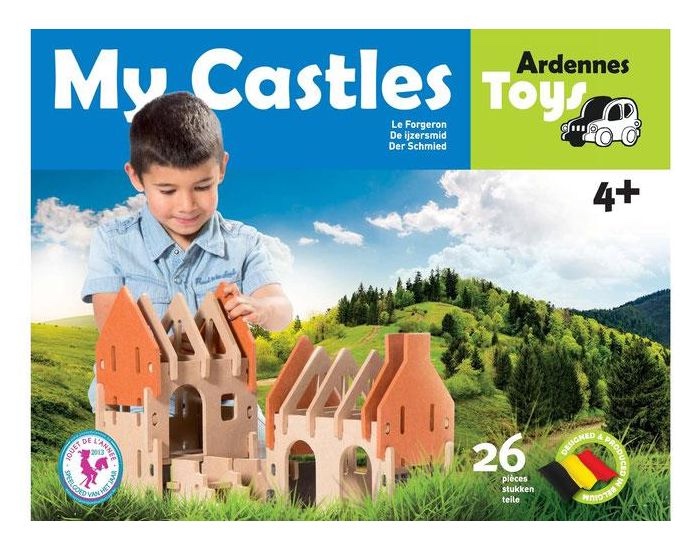 Le Forgeron d’Ardennes Toys. Les pièces s’assemblent sans clous ni vis. La partie « village » de la collection My Castles est bien représentée avec cet ensemble de 26 pièces en bois tout charmant qui complètera à merveille la gamme des châteaux. Designé et fabriqué en Belgique.