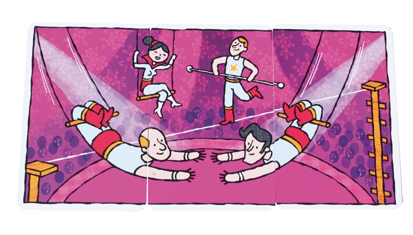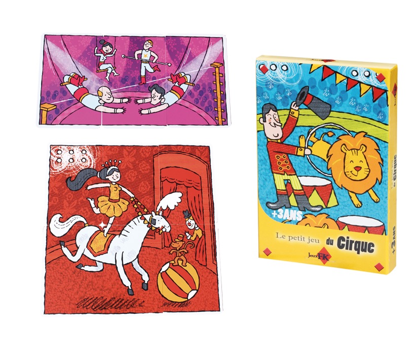 En assemblant 2, 3, 4 ou 6 cartes de ce Petit jeu du Cirque, on peut reconstituer différentes saynètes : les écuyers, les acrobates, le dompteur, les clowns bien sûr, etc. Les cartes sont posées en vrac sur la table. Celui qui tire la première carte d’une saynète peut l’entamer. Les cartes tirées ensuite sont données au joueur qui a déjà entamé la scène. Il faut reformer un maximum de saynètes pour gagner. Convient aussi pour jouer seul à faire des mini-puzzles.