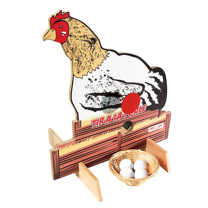 Le tir à la poule, un jeu de plein air ! Visez la poule pour faire tomber les oeufs dans le panier.