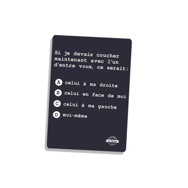 Vous devez lire la carte question et les réponses à voix haute et les autres joueurs doivent voter pour la réponse qu’ils pensent que vous avez choisie.
