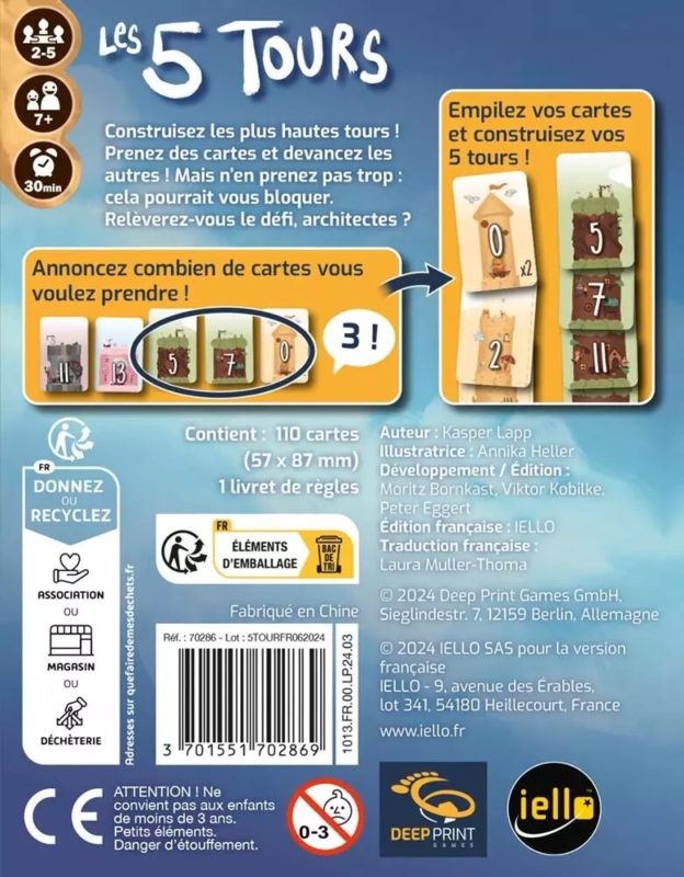 Le jeu est conçu pour 2 à 5 joueurs, offrant une flexibilité parfaite pour les soirées entre amis ou en famille. Les cartes sont de cinq types différents : Tour Sylvestre, Tour Bonbon, Tour Hantée, Tour de Sable, et Tour de Métal. Les différentes Tours nécessiterons de la stratégie pour optimiser la construction et maximiser les points.