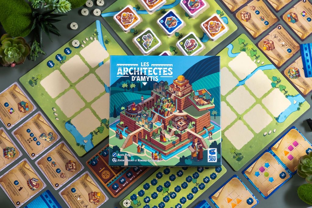 Dans Les Architectes d’Amytis, vous choisissez une des tuiles disponibles, en plaçant un pion Architecte, sur le plateau Central et la placez sur votre plateau Cité. Ce faisant vous devrez adapter votre stratégie en fonction de 3 types de scoring : – Le scoring brut des bâtiments à la pose (6 types différents) – Le scoring lié aux Projets du Roi, en arrangeant des patterns de couleurs dans votre Cité, correspondant à vos cartes Projet (accompli tout au long de la partie, mais seulement comptabilisé à la fin) – Le scoring de fin de partie des Faveurs du Roi, en alignant 3 de vos pions Architecte sur le plateau Central, pouvant orienter grandement votre stratégie Dès que 2 des piles de tuiles du plateau central sont vides, la partie prend fin. La cité la plus prestigieuse remporte la Victoire ! Chaque type de bâtiment possède 2 scorings (recto et verso de la carte Bâtiment) spécifiques. Vous pourrez donc varier les plaisirs à chaque partie pour plus de rejouabilité.