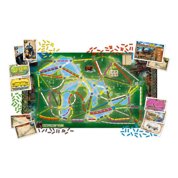 Contenu : 1 plateau de jeu double-face (Monde / Grands Lacs), 165 wagons en plastique, 250 bateaux en plastique, 140 cartes Transport (56 x 87 mm Format Standard USA), 120 cartes Destination (56 x 87 mm Format Standard USA), 15 ports, 5 marqueurs de score.