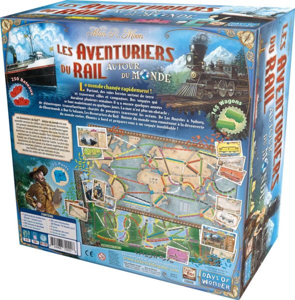 Les Aventuriers du Rail Autour du monde est une nouvelle version du célèbre jeu d’aventures ferroviaires. Le jeu reprend la mécanique de base du jeu original mais apporte également plein de nouveautés, qui rendent cet opus singulier. L’ajout des voies maritimes apporte de la variété et de la profondeur dans les choix stratégiques des joueurs. Aux célèbres petits wagons colorés, s’ajoutent désormais des navires, qui trouveront facilement leur place dans les plans des voyageurs. Pour espérer gagner, les joueurs devront habilement concentrer leur stratégie autour d’un compromis entre les voies ferroviaires et maritimes. Le jeu offre de nouvelles possibilités qu’il faudra impérativement dompter pour triompher.