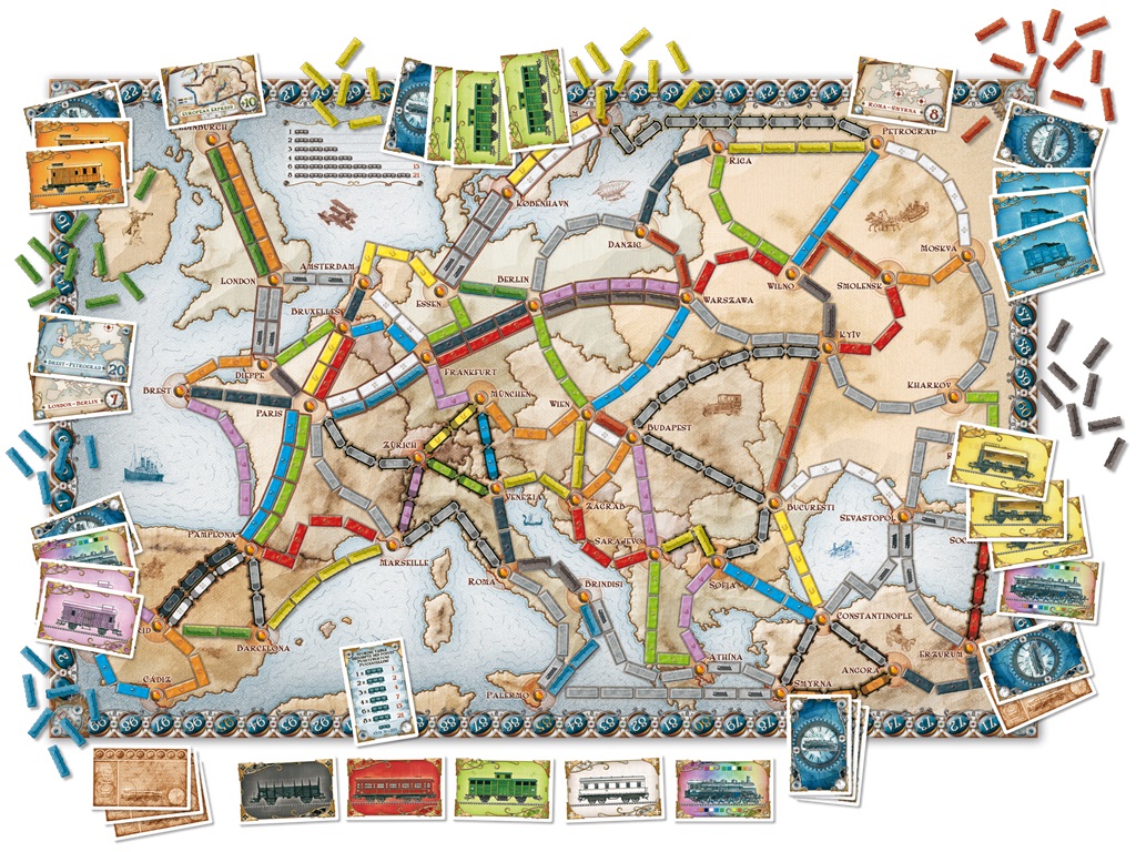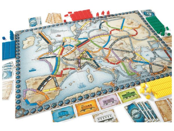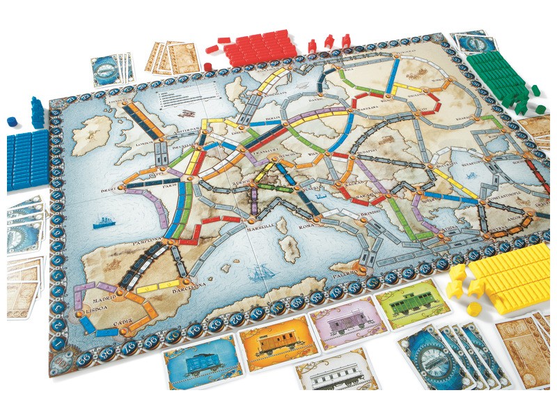 Dans ce célèbre jeu, replongez dans l’âge d’or du chemin de fer. Lancez-vous à la conquête du rail et tentez de prendre le contrôle du réseau ferroviaire européen en reliant un maximum de villes entre elles. Commencez la partie en piochant vos objectifs et partez à l’assaut des chemins de fer. Les objectifs représentent les liaisons entre deux villes que vous devrez impérativement établir. Ils sont très importants pour le déroulement de la partie, car s’ils ne sont pas remplis à la fin de la partie, vous obtiendrez un malus par objectif non respecté.