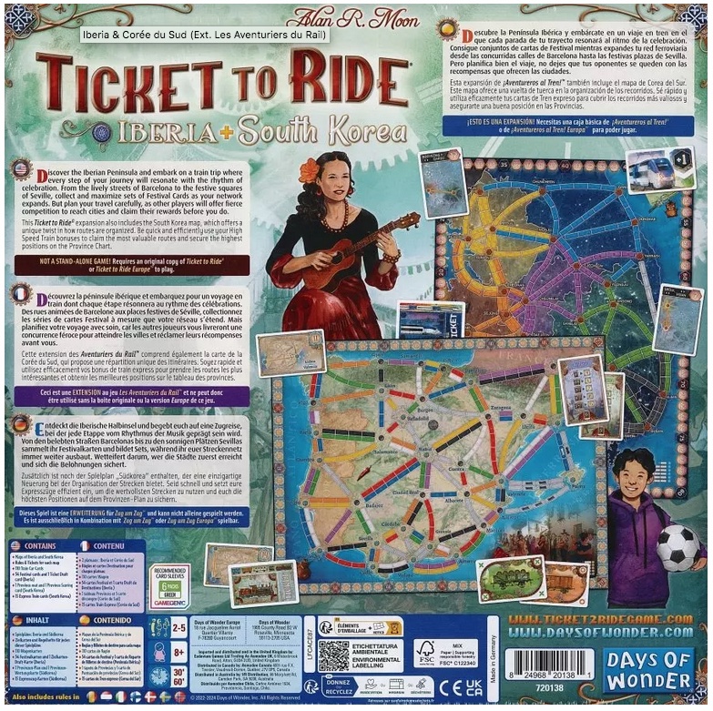Contenu : 2 plateaux (Ibérie et Corée du sud), 110 cartes Wagon, 54 cartes Festival, 1 carte Draft de Destinations, 1 tableau de provinces, 15 cartes Train Express, un livret de règles pour les deux plateaux.