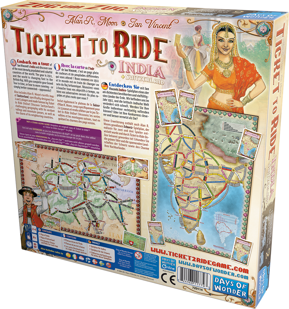 Avec la carte de l’Inde c’est un pays plein de couleurs qui vous attend !  Nous sommes en 1911 et le monde est en train de changer au sein du Raj britannique. Réussirez-vous à boucler tous vos objectifs à temps, ou bien vos adversaires seront-ils plus rapides et plus rusés que vous ? Inclut également le plateau de la Suisse, conçu spécifiquement pour 2 à 3 joueurs pour découvrir les vertes vallées et les montagnes helvètes, tout en goûtant les charmes des pays voisins.
