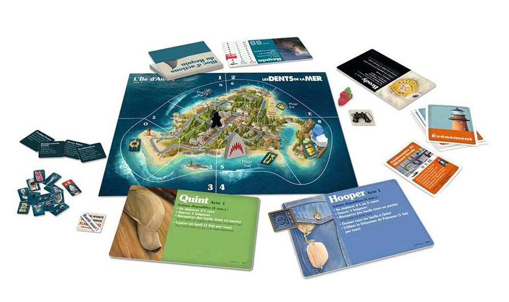 Matériel : 22 cartes Équipement (59×92 mm), 16 cartes Événement (59×92 mm), 3 dés, 1 bloc d’actions du Requin, 4 fiches Personnage, 4 curseurs, 8 tuiles Bateau, 40 tuiles et jetons divers, 1 règle du jeu.