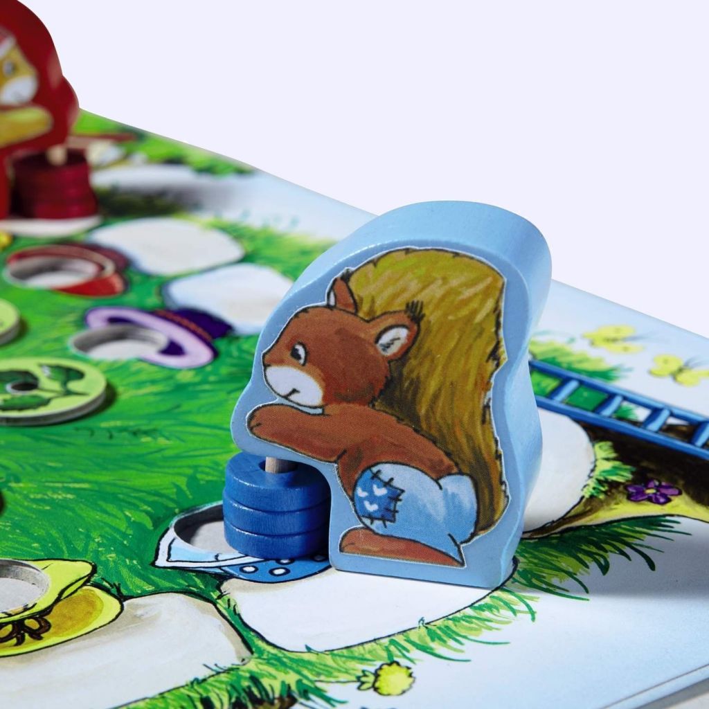 Les écureuils imaginés par Thomas Daum sont magnifiques ! Outre la noblesse du beau bois coloré, ils sont équipés d’un ingénieux système de « plantoir » qui leur permet, en glissant sur le plan de jeu, d’emporter leurs petites graines et de les semer dans les endroits appropriés.