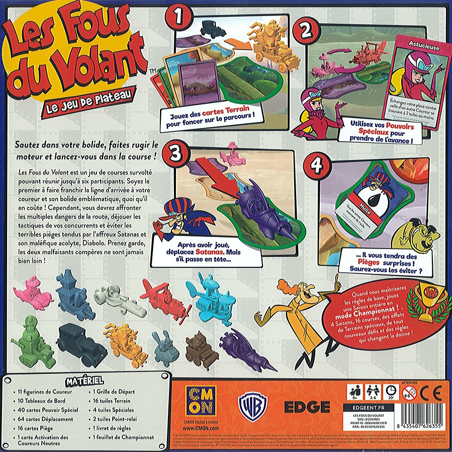 Contenu : 11 figurines de Coureur, 10 Tableaux de Bord, 40 cartes Pouvoir Spécial, 64 cartes Déplacement, 16 cartes Piège, 1 carte Activation des Coureurs Neutres, 1 Grille de Départ, 16 tuiles Terrain, 4 tuiles Spéciales, 2 tuiles Point-relai, 1 livret de règles, 1 feuillet de Championnat.