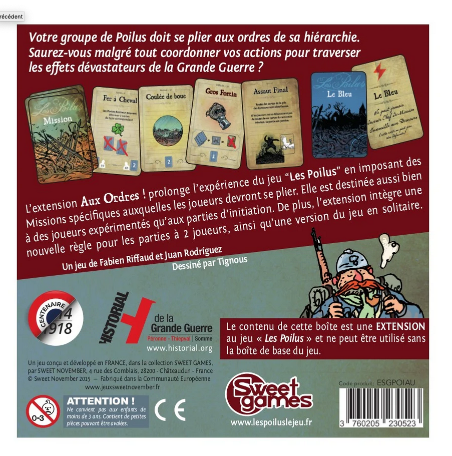La première extension pour Les Poilus.  L’extension Aux Ordres ! prolonge l’expérience du jeu « Les Poilus » en imposant des missions spécifiques auxquelles les joueurs devront se plier. Adapté aussi bien aux joueurs confirmés que novice … idéal pour des parties d’initiation.