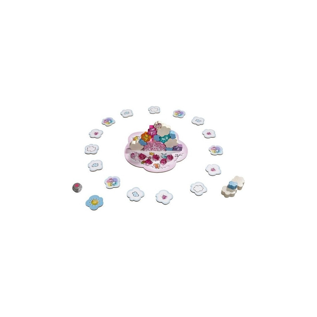 Règles de jeu : Placer le plateau de jeu « nuage » au milieu de la table et y insérer le château des nuages. Poser les tuiles « nuage », face claire visible, tout autour du plateau de jeu, placer Rosalie sur une des tuiles ; réserver les licornes, cristaux de nuage et nuages à côté du plateau.