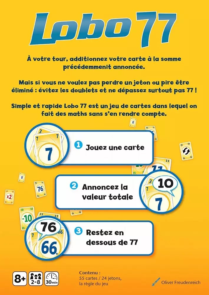 Mais si le total est un doublé (11, 22, 33 etc.) vous perdez un jeton; et s’il dépasse 77 la manche est terminée. Des cartes spéciales peuvent vous aider…ou vous couler ! Le dernier à avoir encore des jetons gagne la partie.