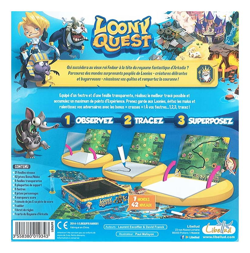 Loony Quest est un jeu aux règles simples pour jouer en famille ou entre amis. Les niveaux de difficulté sont croissants et les objectifs sont variés : relier, entourer, pointer, ce qui permet des parties toujours renouvelées.