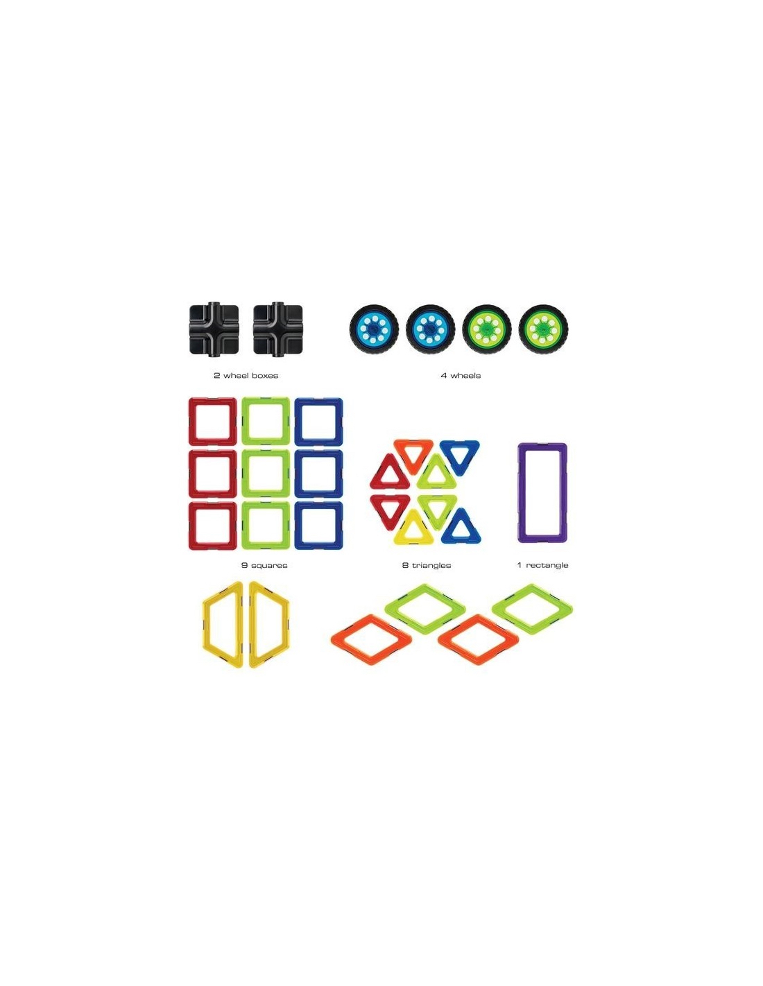 Contenu : 30 pièces colorées, 9 carrés, 8 triangles, 1 rectangle, 2 trapèzes, 4 losanges, 2 bas de caisse et 4 roues.