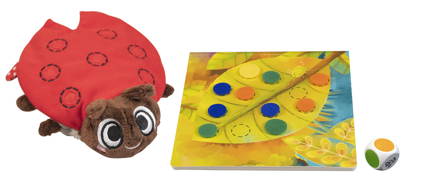 Contenu : 1 Peluche, 1 dé coloré, 12 ronds colorés, 1 histoire et règle du jeu.