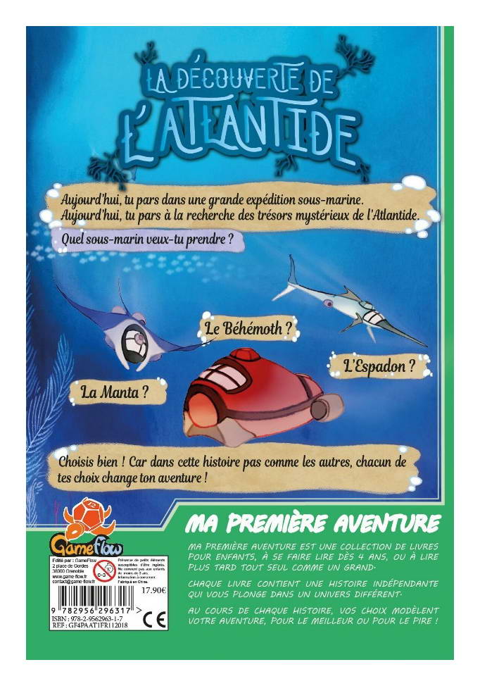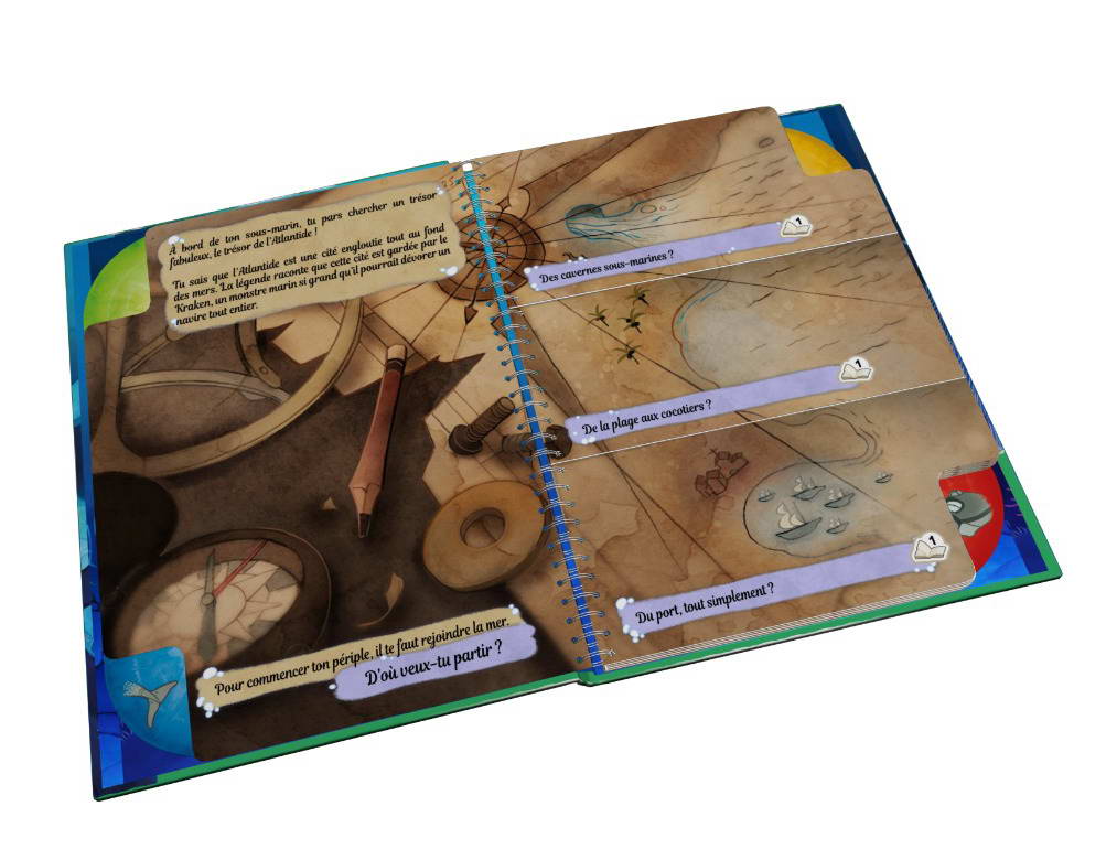 Et maintenant, ton expédition sous-marine peut commencer. Tu vas pouvoir lire ce livre normalement, de gauche à droite, mais rapidement, tu feras face à des choix matérialisés par des pages coupées en trois. Tourne la partie de ton choix et découvre ce qu’il va se passer. Après plusieurs choix, tu arriveras à la fin de ton aventure… Réussiras-tu à trouver le trésor de l’Atlantide ? Une fois la lecture terminée, tu peux recommencer pour découvrir de nouveaux chemins ou essayer avec un autre sous-marin.