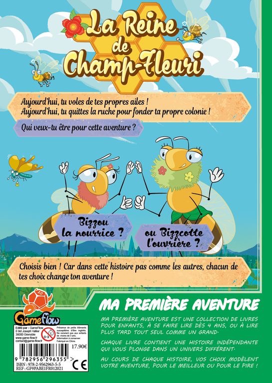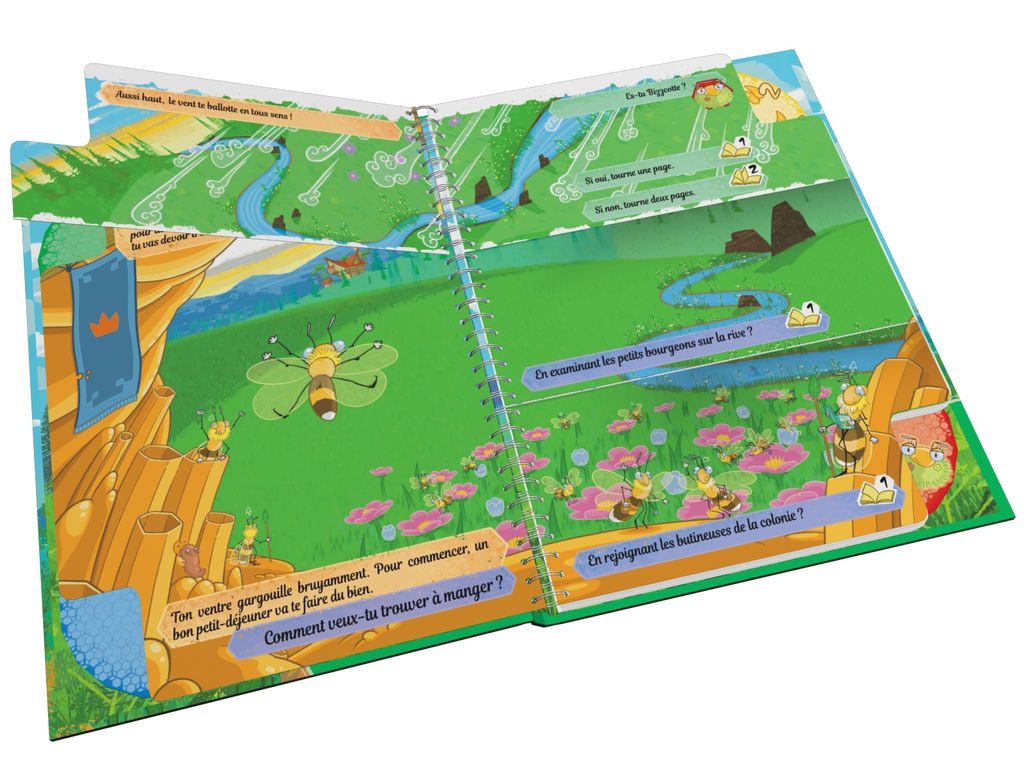 Crée ta propre histoire : A chaque page coupée en trois tu devras faire un choix. Ouvre le livre et choisis l’abeille que tu souhaites incarner : Bizzcotte, l’ouvrière puissante et téméraire ? Ou Bizzou, la nourrice fine et pleine de malice ? Maintenant, ton aventure peut commencer. Tu vas pouvoir lire ce livre normalement, de gauche à droite, mais rapidement, tu feras face à des choix matérialisés par des pages coupées en trois. Tourne la partie de ton choix et découvre ce qui va se passer. Après plusieurs choix, tu arriveras à la fin de ton aventure… Seras-tu la nouvelle reine de Champ-Fleuri ? Une fois la lecture terminée, tu peux recommencer pour découvrir de nouveaux chemins et/ou essayer avec un autre personnage.