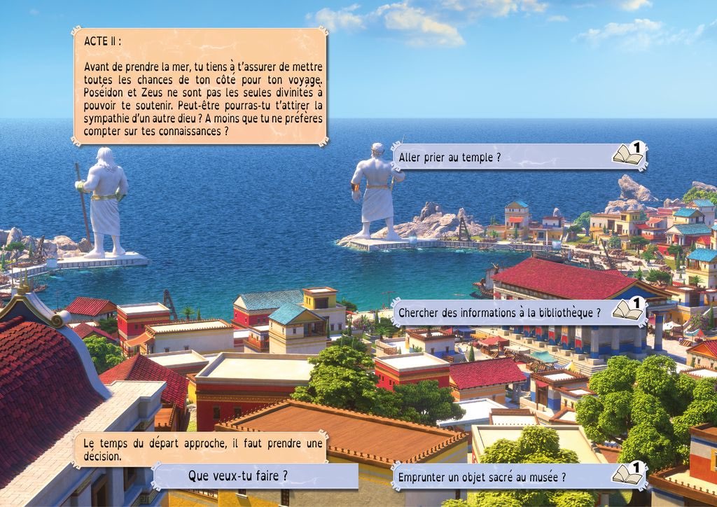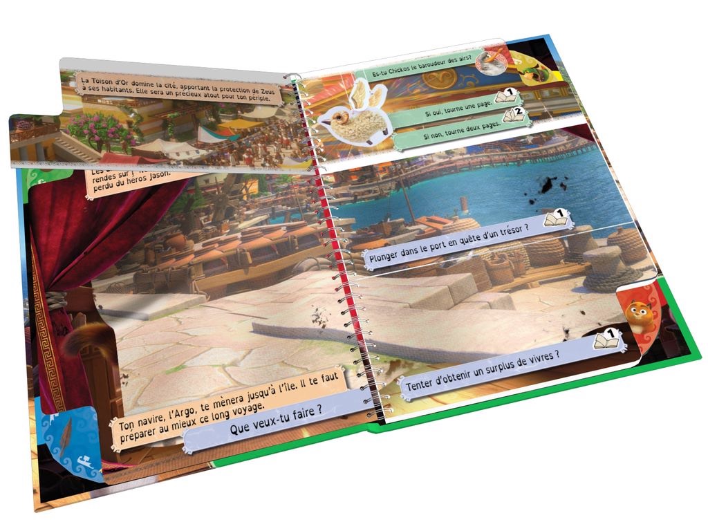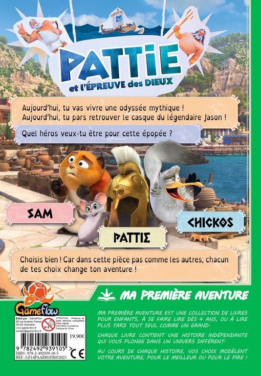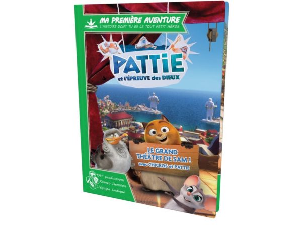 Entre dans l’univers du film « Pattie et la colère de Poséidon » et Crée ta propre histoire : à chaque page coupée en trois, tu devras faire un choix. Ouvre le livre et choisis le personnage que tu souhaites incarner : Pattie la souris maline et curieuse, Sam le matou passionné de théâtre ou Chickos le baroudeur des airs ? Maintenant, ton aventure peut commencer. Tu vas pouvoir lire ce livre normalement, de gauche à droite, mais rapidement, tu feras face à des choix matérialisés par des pages coupées en trois. Tourne la partie de ton choix et découvre ce qui va se passer. Après plusieurs choix, tu arriveras à la fin de ton aventure… Réussiras-tu à retrouver le Casque de Jason ?  Une fois la lecture terminée, tu peux recommencer pour découvrir de nouveaux chemins et/ou essayer avec un autre personnage.