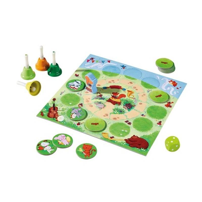 Contenu du jeu : 1 plateau de jeu – illustré sur les deux faces, 4 clochettes, 1 chef d’orchestre – Éric l’écureuil, 12 plaquettes rondes représentant des animaux, 12 plaquettes rondes représentant des clochettes, 1 dé, 1 règle du jeu.