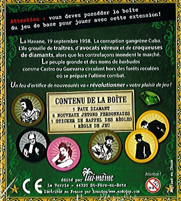 Contenu : 1 faux diamant, 6 nouveaux jetons personnages, 1 sticker rappel des règles, 1 règle de jeu.